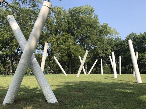 The main installation is on a ridge in a walnut grove adjacent to the Starlight Theater and Kansas City Zoo (at the intersection of Zoo Drive and Starlight Road). At the top of the ridge a cluster of columns suggest an archeological ruin while others cascade down the ridge face. Additional columns are sited to offer a meandering, intimate walk at woods' edge for more accessible readings. Cellphone light both activates the columns' reflective properties and the barcodes applied to columns to prompt corresponding audio readings.