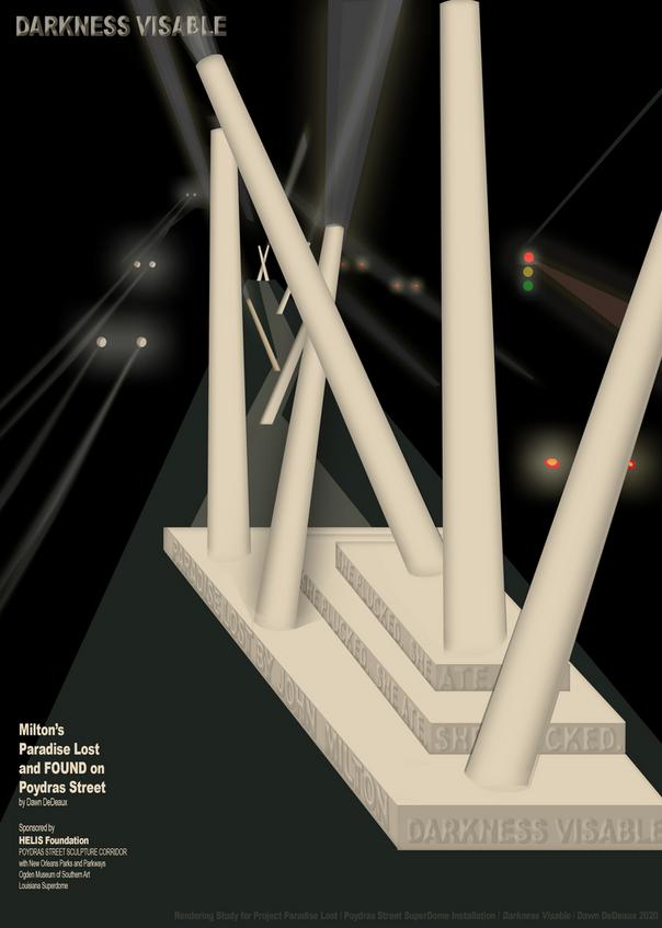 FREE FALL is a large-scale sculpture installation by NewOrleans-based artist Dawn DeDeaux created for KansasCity's international art venue OPEN SPACES led by veteran Artistic Director Dan Cameron. The work tributes 'Paradise Lost' by John Milton published in 1667, considered among the world's most important literary offerings. Selections from the epic poem appear on 48 concrete columns, installed at angles as though in a state of fall throughout a quarter mile section of the majestic Swope Park. The text is generated in highway reflective vinyl to offer distinctive appearances that vary from day to night: by day the text reads in subtle pearlescence typography; and by night the verse transforms into a glowing vibrancy before the light of cellphones and headlights of passing cars - creating a moving, ever-changing choreography of light and language.