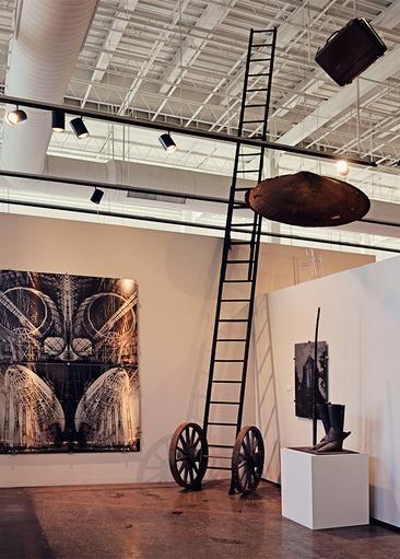 DeDeaux employs a repeated theme of ladders — a mode of lonesome travel, ascending from the past into a better future — some cast from the most modern of materials while bear- ing mysterious ancient symbols. Other forms are charred, including timbers salvaged from a disastrous fire in DeDeaux’s own studio. Large wall panels printed on metal and bear- ing darkened images of dirigibles and moody oaken branches give a gothic undertone to the viewing. While less overtly disturbing than the William Christenberry work that occupied the same space last year with its allusion to Ku Klux Klan activity, the sight of ladders in trees can’t help but call to mind tales of lynchings from a region where “the past isn’t even past.”